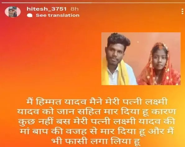 ”मैं हिम्मत यादव मैने अपनी पत्नी लक्ष्मी यादव को जान सहित मार दिया हूँ। कारण कुछ नहीं बस मेरे पत्नी लक्ष्मी यादव के मां बाप की वजह से मारा मारा हूँ और मैं खुद भी फांसी लगा कर जान दे रहा हूँ…”
