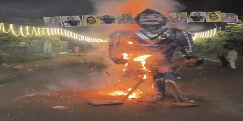 दशहरे पर हुए रावण दहन कार्यक्रम में रावण के दस सिर की जगह इंदौर के चर्चित राजा रघुवंशी हत्याकांड की आरोपी सोनम रघुवंशी समेत अन्य महिलाओं की तस्वीरें लगाई गईं और उनको जलाया गया. इस दौरान एक व्यक्ति ने राजा रघुवंशी की तस्वीर लगाकर रावण के पुतले को आग लगाई.